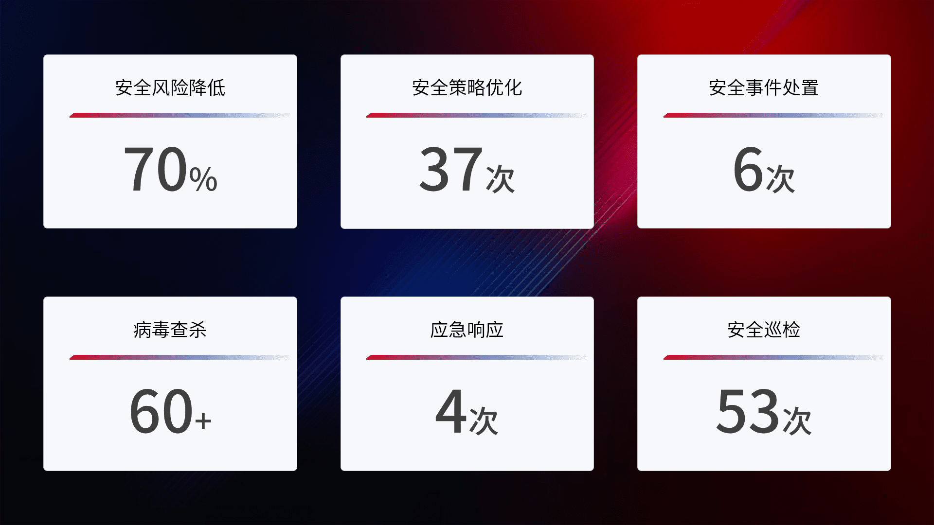 提供全面的安全事件报告体系,,包括处置报告、、周报、、、季度和年度总结,,结合持续监控,,,,帮助客户深入了解网络安全状况。。